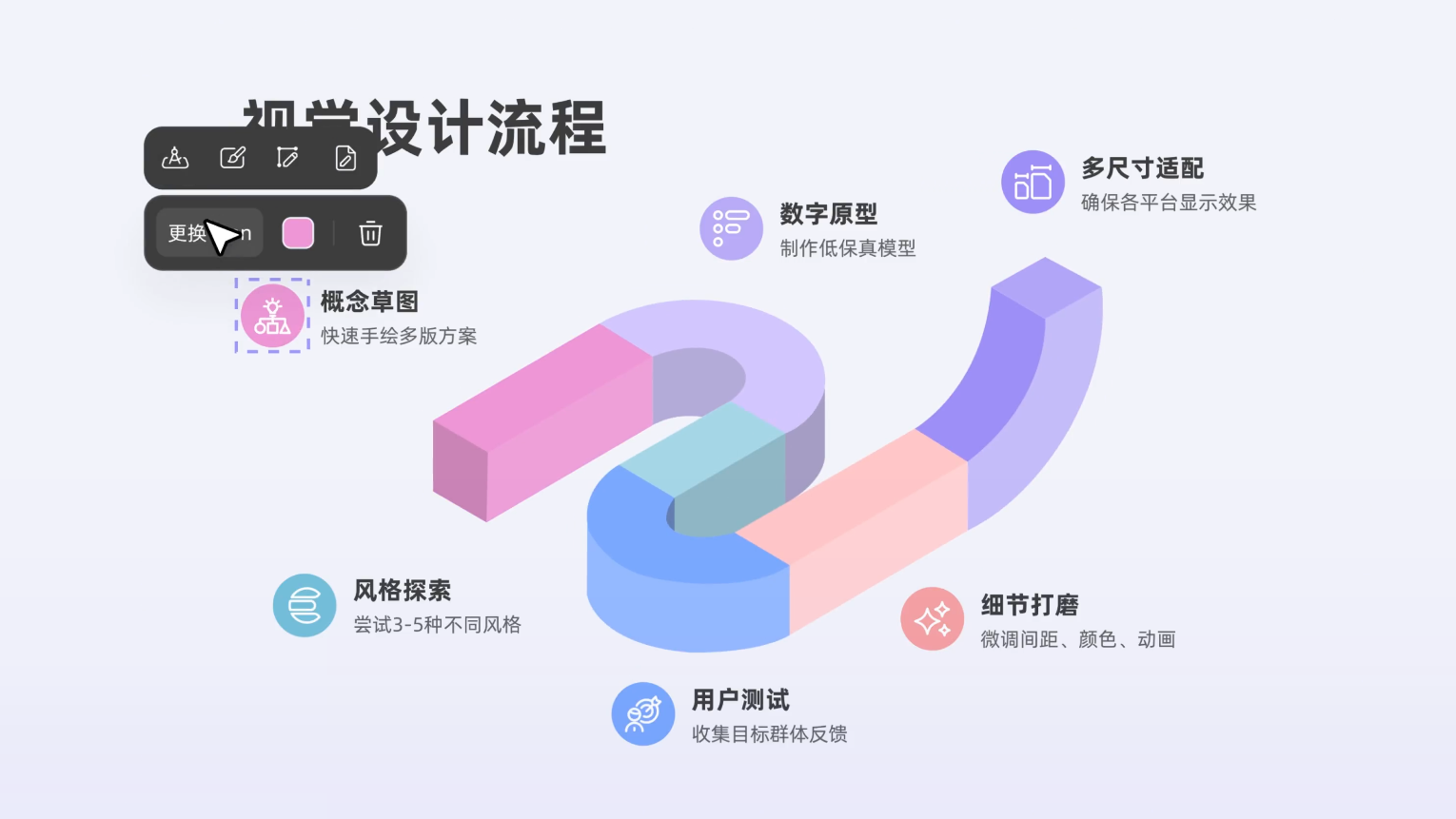 - 智能编辑:大纲改项数、AI 配色、AI 配图标、切换 3D / 扁平 / 卡通风格
